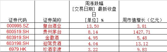 从白酒板块个股走势来看,皇台酒业冲高回落,周涨幅达到13.5%;贵州茅台周涨幅达到8.14%,周中市值一度突破两万亿元大关,本周市值增长1427.71亿元;此外,金徽酒、迎驾贡酒、珍酒李渡的周涨幅也均在3%以上。